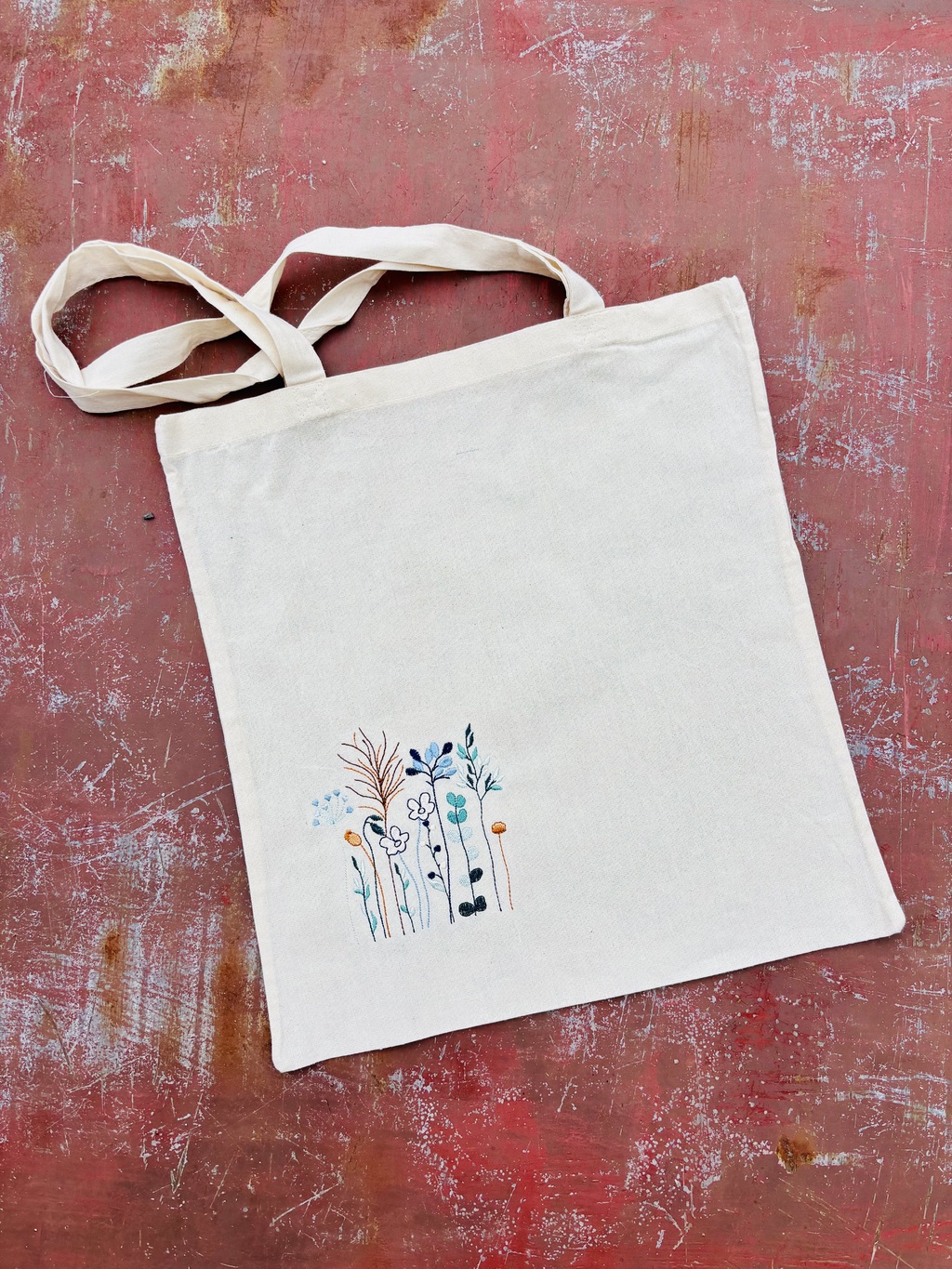 Plátěná taška s výšivkou lučního kvítí modrá