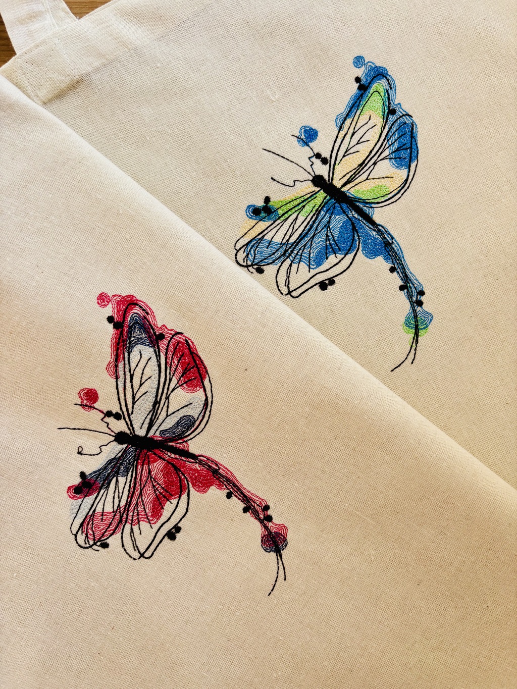 Praktická látková taška s výšivkou vážky. Velikost tašky je 35 x 40 cm. Taška má delší ucha - 60 cm na přehození přes rameno.